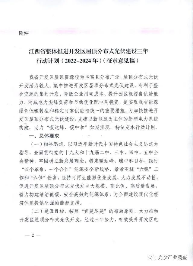 近日,江西省發(fā)改委印發(fā)《江西省整體推進(jìn)開(kāi)發(fā)區(qū)屋頂分布式光伏建設(shè)三年行動(dòng)計(jì)劃(2022-2024年)(征求意見(jiàn)稿)》。明確提出建設(shè)目標(biāo):按照“宜建盡建”的布局原則,大力推動(dòng)開(kāi)發(fā)區(qū)屋頂分布式光伏開(kāi)發(fā),經(jīng)過(guò)三年努力,有效提升開(kāi)發(fā)區(qū)電力系統(tǒng)安全保障能力。