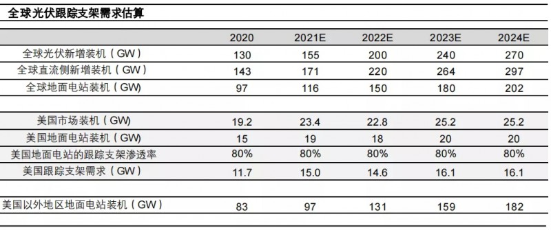 隨著跟蹤支架持續(xù)技術(shù)迭代,其經(jīng)濟(jì)性和可靠性等方面的性能持續(xù)提升,相對固定支架的優(yōu)勢有望進(jìn)一步凸顯,從而推動(dòng)跟蹤支架滲透率的提升。我們估算,未來3年內(nèi),全球跟蹤支架需求有望達(dá)到34%,美國以外地區(qū)的跟蹤支架需求的復(fù)合增速有望達(dá)到45%。