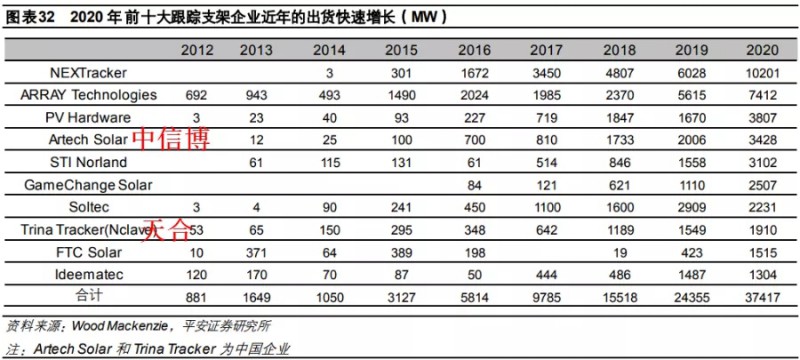 在2012-2020年度全球10大跟蹤企業(yè)出貨量排名中,中信博和天合光能是國內(nèi)僅有的2家進(jìn)入全球出貨前10的跟蹤支架企業(yè)。