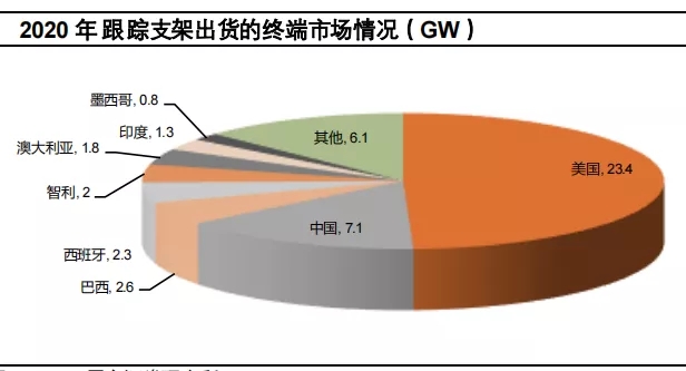 近年,隨著光伏需求的增長以及跟蹤支架性價(jià)比的提升,全球跟蹤支架出貨量呈現(xiàn)快速增長。據(jù)彭博新能源統(tǒng)計(jì),2020年度全球跟蹤支架出貨 47.5GW,其中美國市場需求23.4GW,占比約50%。此外,拉丁美洲、西班牙、澳大利亞、印度、中東等光照條件比較好的地區(qū)的跟蹤支架需求也很可觀。