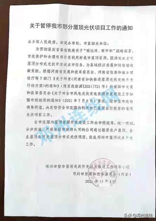 近日,有網(wǎng)友爆料稱,河南省鄧州市以整市屋頂光伏開發(fā)試點推進工作領導小組、市發(fā)改委的名義印發(fā)通知,暫停全市范圍內(nèi)利用自己屋頂自行投資的屋頂光伏項目工作。