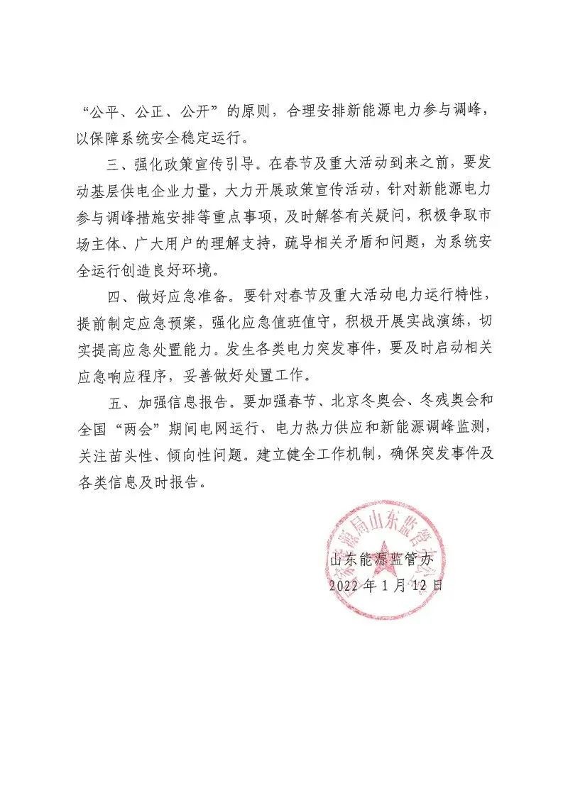 1月12日,山東省能監(jiān)辦《關(guān)于做好2022年春節(jié)及重大活動(dòng)期間電網(wǎng)安全穩(wěn)定運(yùn)行工作的通知》,就春節(jié)期間保障電力系統(tǒng)安全穩(wěn)定運(yùn)行和新能源發(fā)電調(diào)節(jié)能力要求方面提出意見(jiàn)。