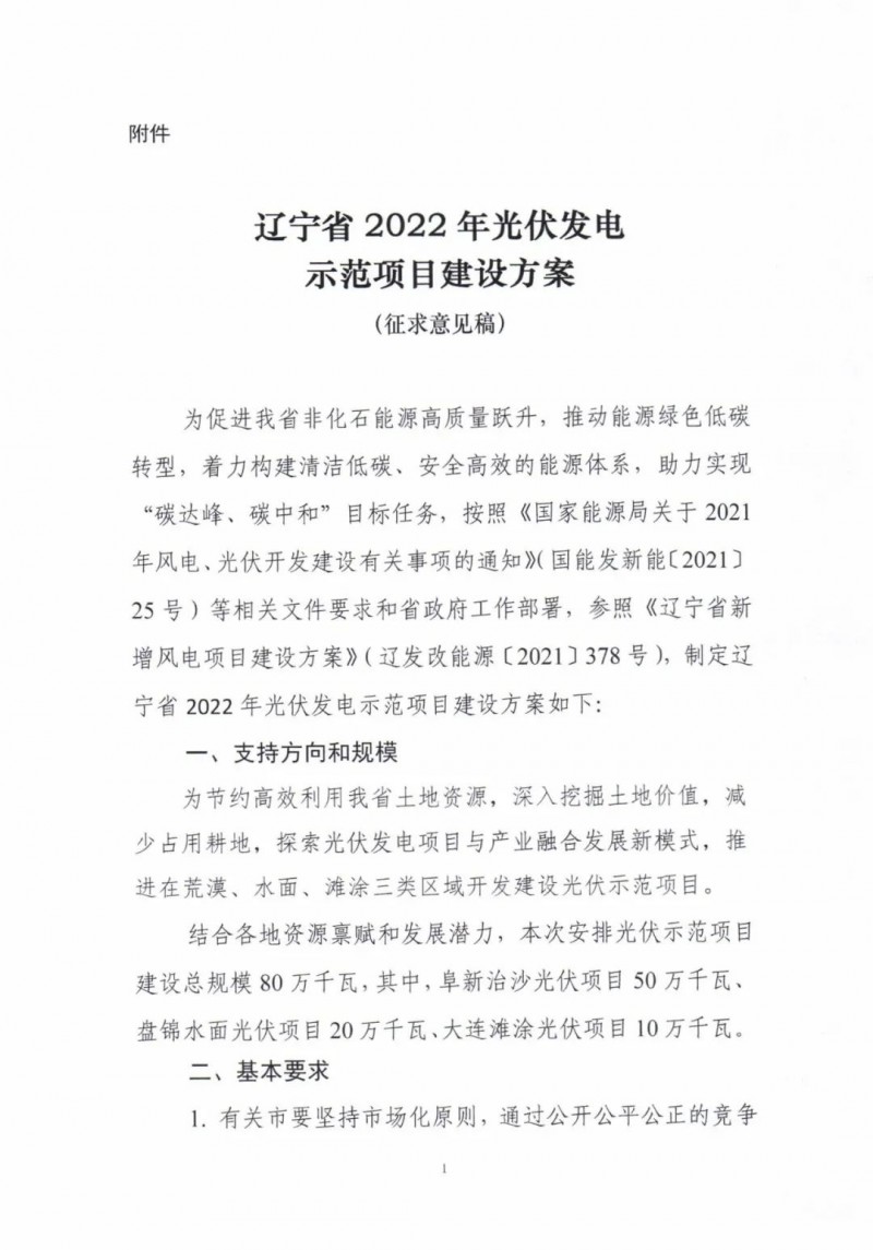 結(jié)合各地資源稟賦和發(fā)展?jié)摿?,本次安排光伏示范?xiàng)目建設(shè)總規(guī)模80萬千瓦,其中,阜新治沙光伏項(xiàng)目50萬千瓦、盤錦水面光伏項(xiàng)目20萬千瓦、大連灘涂光伏項(xiàng)目10萬千瓦。
