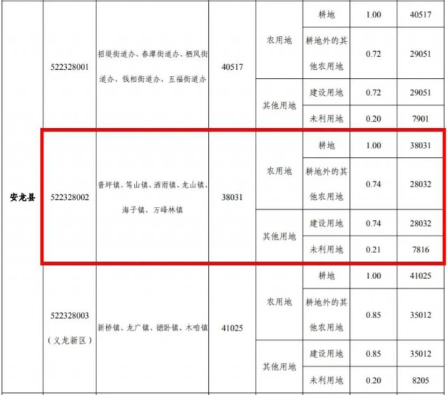 根據(jù)此前發(fā)布的《州人民政府關(guān)于公布實施黔西南州征地區(qū)片綜合地價補償更新標(biāo)準(zhǔn)的通知》(黔西南府函〔2020〕69號)補償標(biāo)準(zhǔn),安龍縣普坪鎮(zhèn)區(qū)片綜合地價為38031元/畝,其中農(nóng)用地耕地補償標(biāo)準(zhǔn)為38031元/畝,耕地外的其他農(nóng)用地補償標(biāo)準(zhǔn)為28032元/畝。