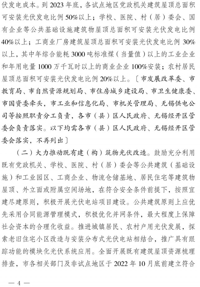 近日,江蘇省無(wú)錫市人民政府印發(fā)《關(guān)于大力推進(jìn)全市光伏發(fā)電規(guī)模化開(kāi)發(fā)應(yīng)用的實(shí)施意見(jiàn)》,文件提出:到2030年,江陰市、宜興市、錫山區(qū)、惠山區(qū)建成全國(guó)整縣(市、區(qū))屋頂分布式光伏開(kāi)發(fā)試點(diǎn)縣(市、區(qū)),力爭(zhēng)創(chuàng)成1-2個(gè)試點(diǎn)示范區(qū),其他地區(qū)結(jié)合地方實(shí)際有序推進(jìn)光伏發(fā)電開(kāi)發(fā)利用。