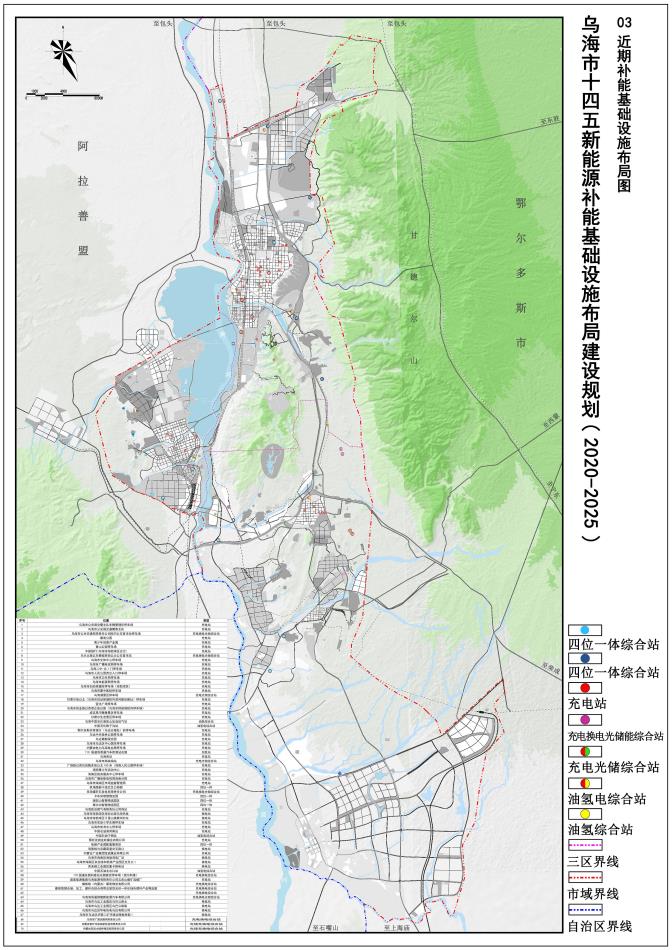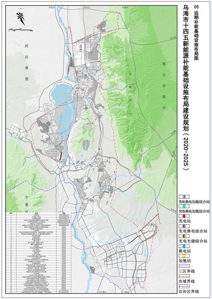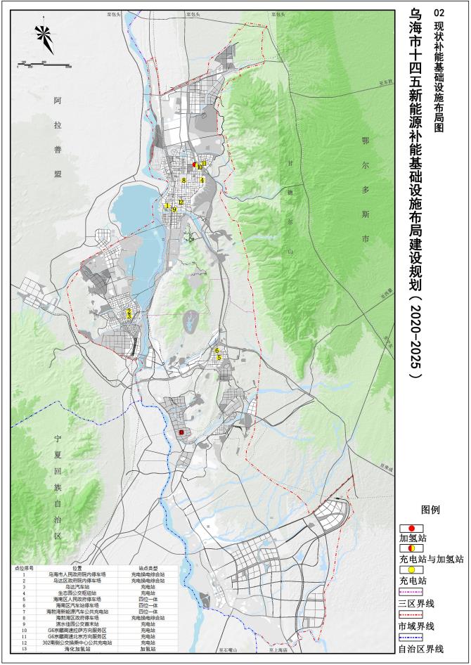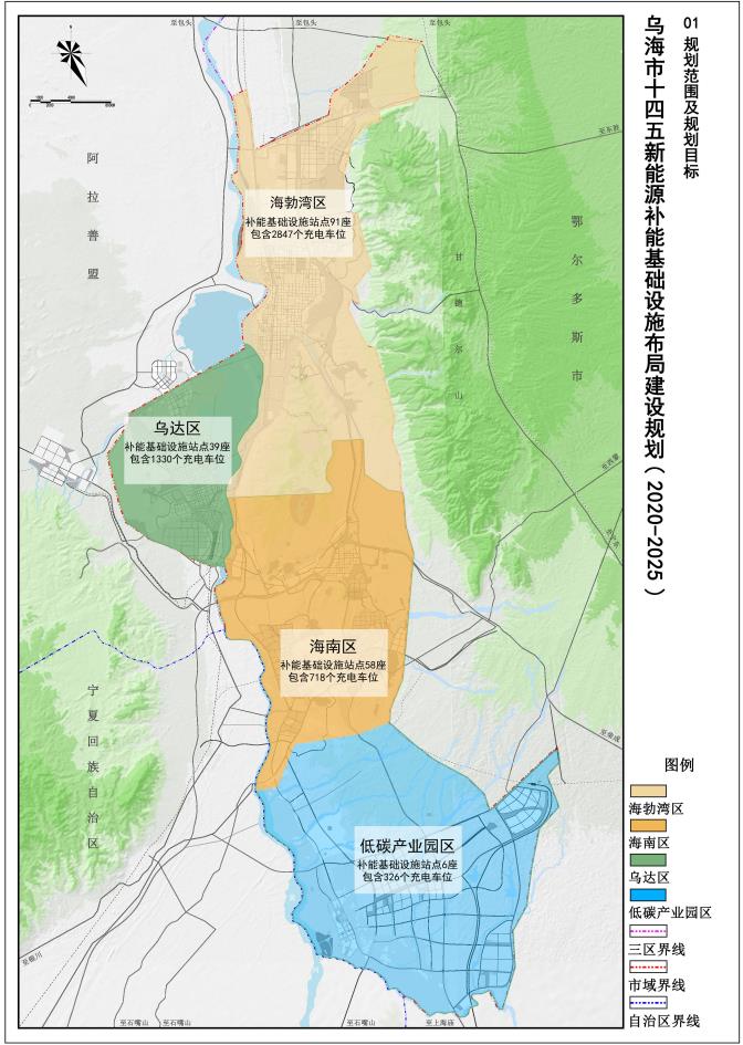 規(guī)劃范圍為全烏海市域范圍,總面積1754平方公里,主要涉及濱河新區(qū)、 海勃灣中心城區(qū)、烏達(dá)中心城區(qū)、海南中心城區(qū)和工業(yè)園區(qū)、物流園區(qū)內(nèi)的充電樁布局、換電站布局、加氫站布局和光伏儲能一體化設(shè)施布局。