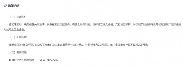 補助標(biāo)準(zhǔn):按照項目裝機500千瓦(8000平方米)及以上容量給予一次性補貼,補貼標(biāo)準(zhǔn)為0.2元/瓦。單個企業(yè)最高補貼不超過200萬元。