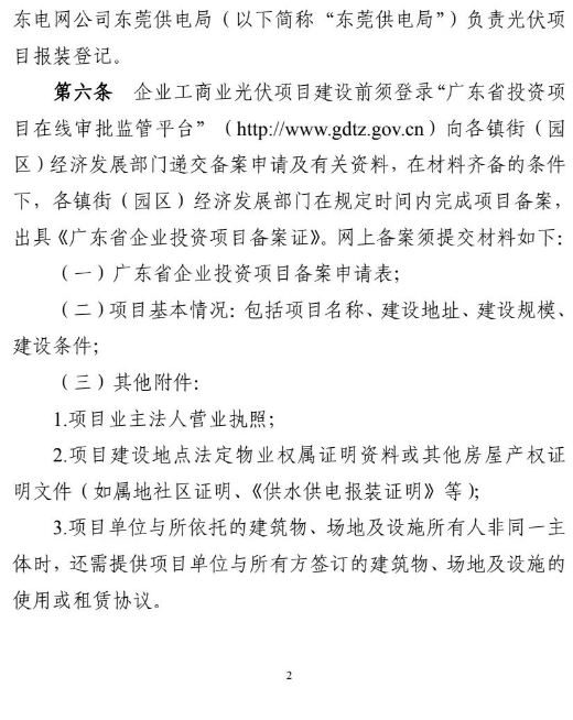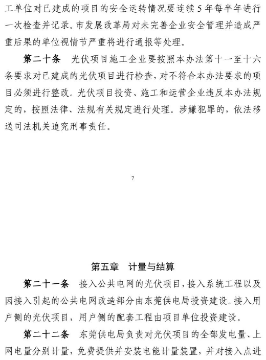 近日,東莞市發(fā)改委印發(fā)《東莞市發(fā)展和改革局分布式光伏發(fā)電項目建設管理辦法》的通知。在通知中提出:光伏項目建設采用的光伏支架要采用防腐防銹材質,材質符合《太陽能光伏系統(tǒng)支架通用技術要求JG/T490》,光伏支架風力荷載與重力荷載等級符合國家鋼結構工程施工質量驗收規(guī)范(GB 50205),平面屋頂項目光伏組件最高點距離鋪設平面的高度不得高于2.8米,具有樓梯間的居民樓項目光伏組件不高于樓梯間屋面1米(最高點應不高于頂屋屋面4米),并且四周均不得圍蔽形成建筑使用空間。