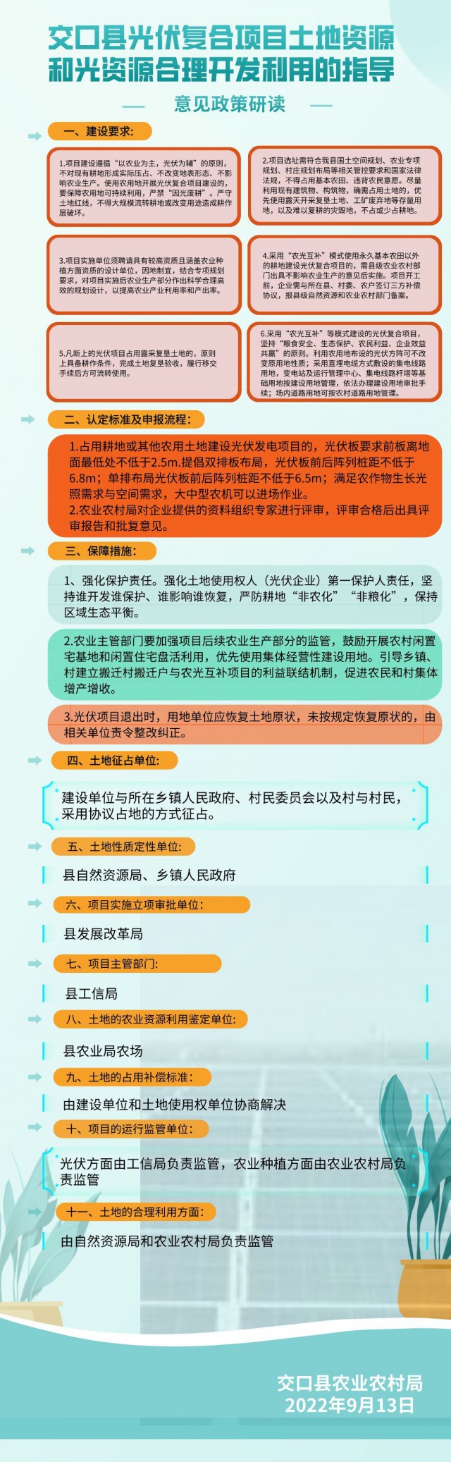 《交口縣光伏復(fù)合項目土地資源和光資源合理開發(fā)利用的指導(dǎo)性意見》已經(jīng)縣人民政府同意,現(xiàn)印發(fā)給你們,請認(rèn)真遵照實施。