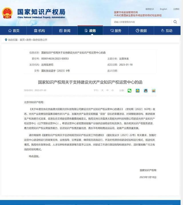 1月30日,國(guó)家知識(shí)產(chǎn)權(quán)局發(fā)布《關(guān)于支持建設(shè)光伏產(chǎn)業(yè)知識(shí)產(chǎn)權(quán)運(yùn)營(yíng)中心的函》,明確支持北京晶澳太陽能光伏科技有限公司(以下簡(jiǎn)稱“晶澳科技”)建設(shè)“光伏產(chǎn)業(yè)知識(shí)產(chǎn)權(quán)運(yùn)營(yíng)中心”。這是光伏制造領(lǐng)域(不含多晶硅)首個(gè)國(guó)家級(jí)知識(shí)產(chǎn)權(quán)運(yùn)營(yíng)中心,體現(xiàn)了國(guó)家對(duì)晶澳科技在光伏制造領(lǐng)域科技實(shí)力和知識(shí)產(chǎn)權(quán)運(yùn)作能力的肯定。
