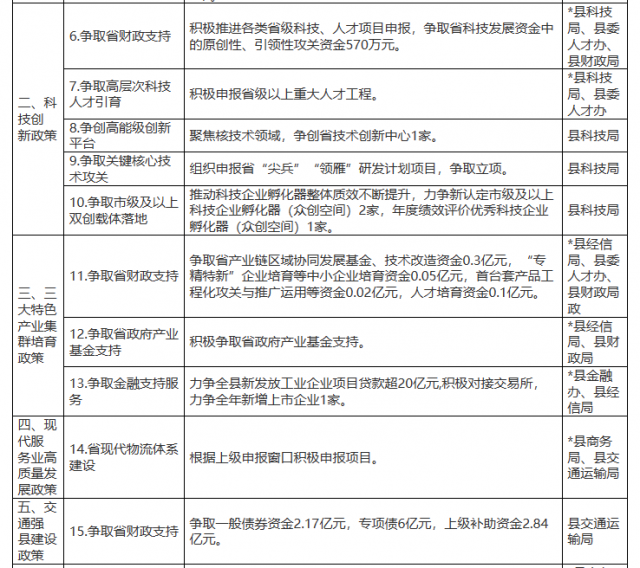上述8個(gè)領(lǐng)域政策縣財(cái)政2023年預(yù)算安排資金,除交叉重疊部分外,支持總額約50億元。各領(lǐng)域政策縣級(jí)牽頭單位要根據(jù)文件要求,會(huì)同財(cái)政金融、自然資源、能源、人才等要素保障單位,抓緊出臺(tái)配套政策文件,及時(shí)做好政策的宣傳解讀、責(zé)任分解和落地實(shí)施,推動(dòng)政策精準(zhǔn)滴灌、直達(dá)快享,確?;鶎佑懈?、群眾獲益、企業(yè)得利。
