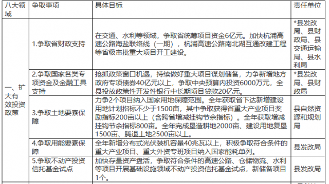 2.向上爭(zhēng)取資金支持。搶抓政策窗口機(jī)遇,謀劃儲(chǔ)備一批符合國家、省重點(diǎn)支持投向領(lǐng)域項(xiàng)目。爭(zhēng)取國家各類專項(xiàng)資金、金融工具對(duì)重大項(xiàng)目的支持,力爭(zhēng)新增地方政府專項(xiàng)債券40億元以上,力爭(zhēng)中央預(yù)算內(nèi)投資6000萬元,全縣投放政策性開發(fā)性銀行中長期項(xiàng)目貸款20億元以上。