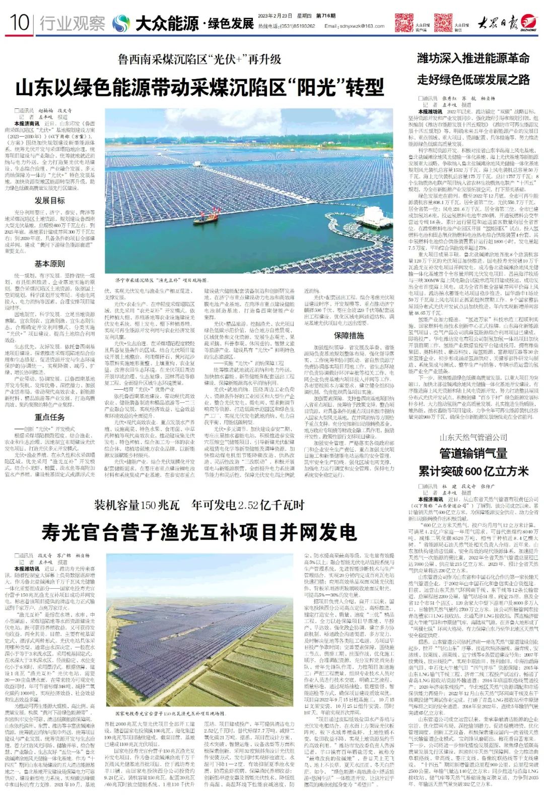 充分利用棗莊、濟寧、泰安、菏澤等地采煤沉陷區(qū)土地資源,規(guī)劃建設(shè)魯西南大型光伏基地,總規(guī)模600萬千瓦左右。到2025年底,基地累計建成并網(wǎng)300萬千瓦左右;到2030年底,具備條件的項目全部建成并網(wǎng),建成“黃河下游綠色能源廊道”重要支點。