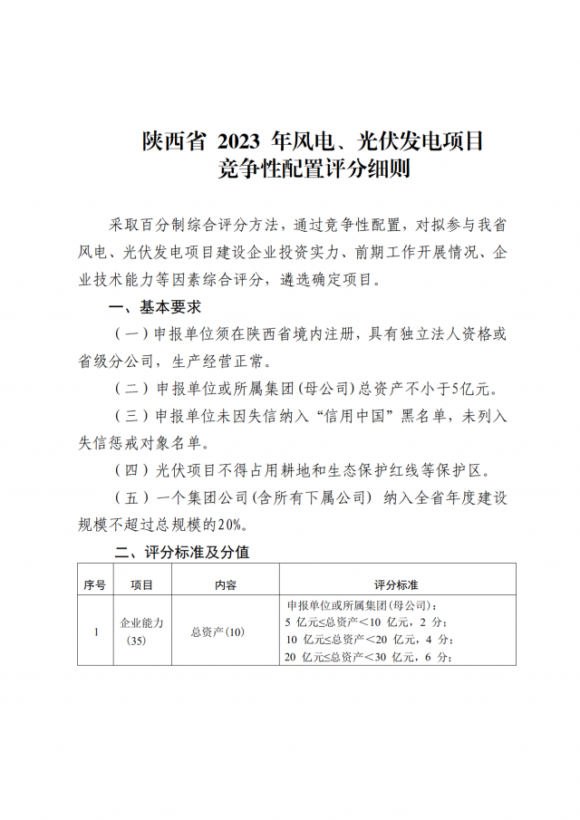 在光伏、風(fēng)電競爭性配置評分細(xì)則上,要求申報單位須在陜西省境內(nèi)注冊,具有獨(dú)立法人資格或省級分公司,生產(chǎn)經(jīng)營正常。申報單位或所屬集團(tuán)(母公司)總資產(chǎn)不小于5億元。另外,一個集團(tuán)公司(含所有下屬公司)納入全省年度建設(shè)規(guī)模不超過總規(guī)模的20%。具體評分細(xì)則如下: