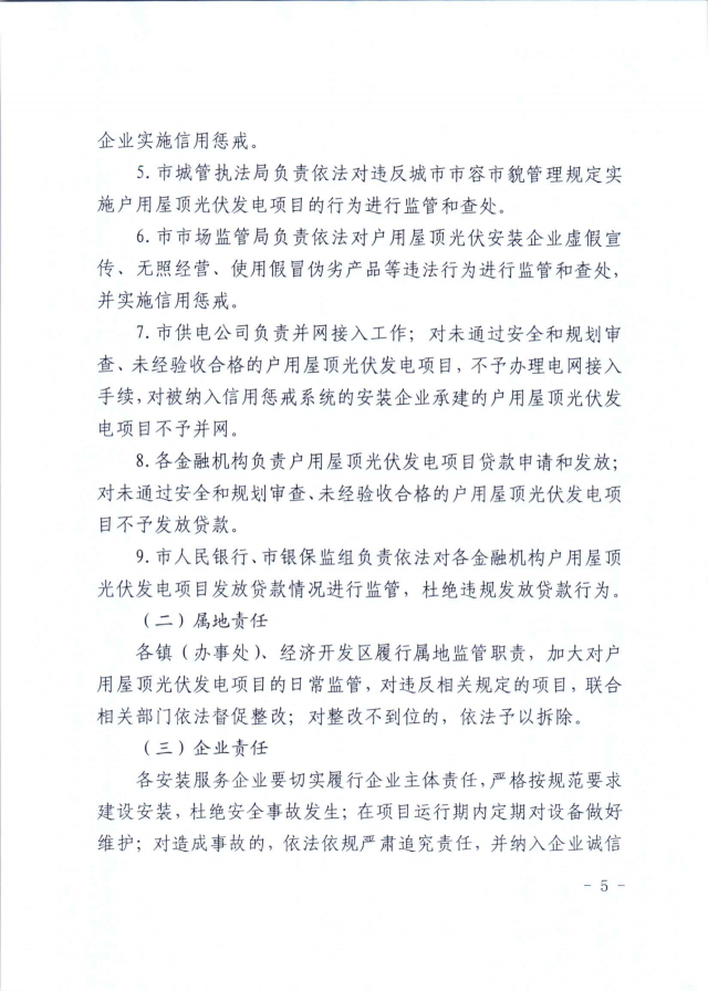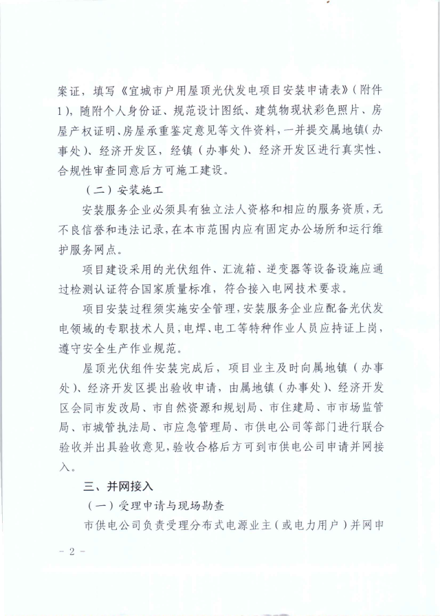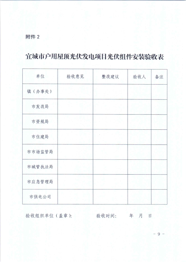 屋頂光伏在組件安裝完成后,業(yè)主需向屬地鎮(zhèn)、經濟開發(fā)區(qū)提出驗收申請,然后會同市發(fā)改局、自然資源和規(guī)劃局、住建局、市場監(jiān)管局、城管執(zhí)法局、應急管理局、供電公司等部門聯合驗收并出具驗收意見。