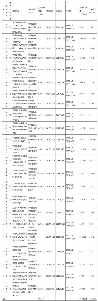 根據(jù)區(qū)經(jīng)濟(jì)和信息化局、區(qū)財(cái)政局《關(guān)于太陽(yáng)能光伏發(fā)電資助的實(shí)施細(xì)則》(富經(jīng)信財(cái)〔2018〕10號(hào),富財(cái)企〔2018〕428號(hào)),《杭州市富陽(yáng)區(qū)人民政府關(guān)于深入實(shí)施高新工業(yè)強(qiáng)區(qū)戰(zhàn)略的若干意見(jiàn)(試行)》(富政〔2018〕4號(hào))及區(qū)政府文件處理單2020年第501號(hào)之規(guī)定,我區(qū)組織開展2023年富陽(yáng)區(qū)非居民光伏發(fā)電項(xiàng)目區(qū)級(jí)補(bǔ)貼兌現(xiàn)工作。經(jīng)區(qū)經(jīng)信局會(huì)同區(qū)財(cái)政局、區(qū)供電公司等相關(guān)部門審核,我區(qū)23家企業(yè)的23個(gè)項(xiàng)目符合補(bǔ)貼條件,擬補(bǔ)貼資金2137167元,詳見(jiàn)附表?,F(xiàn)予以公示,歡迎社會(huì)各界進(jìn)行監(jiān)督。