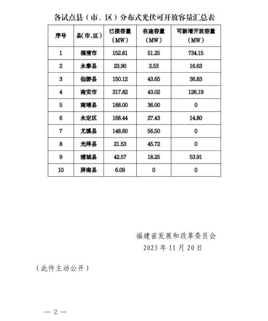 11月20日,福建省發(fā)展和改革委員會(huì)發(fā)布《關(guān)于發(fā)布試點(diǎn)縣分布式光伏接入電網(wǎng)承載力信息的通告》(下稱《通告》)。