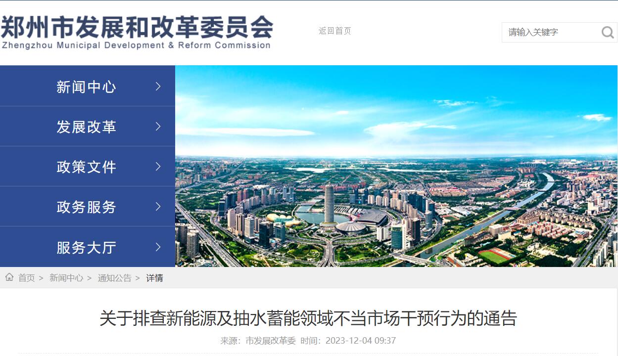 12月4日,河南鄭州發(fā)改委發(fā)布關(guān)于排查新能源及抽水蓄能領(lǐng)域不當(dāng)市場干預(yù)行為的通告。一是強制要求配套產(chǎn)業(yè)。今年以來新能源及抽水蓄能領(lǐng)域,區(qū)縣(市)政府或相關(guān)部門,是否在相關(guān)文件中明確或者變相要求項目必須配套產(chǎn)業(yè)或者引入產(chǎn)業(yè);雖未明文規(guī)定,是否口頭強制要求配套產(chǎn)業(yè),或?qū)τ跊]有允諾配套產(chǎn)業(yè)的項目和投資主體給予阻礙或明顯歧視政策。