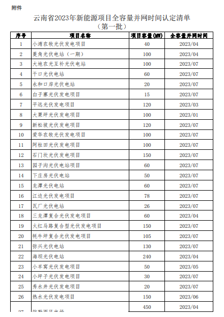 云南省能源局會同有關(guān)部門和發(fā)電企業(yè)共同確定了《云南省新能源項(xiàng)目全容量并網(wǎng)時間技術(shù)認(rèn)定指南(試行)》,并由云南電網(wǎng)公司組織開展全容量并網(wǎng)時間技術(shù)認(rèn)定工作。我局收到云南電網(wǎng)公司提交的24家發(fā)電企業(yè)共89個項(xiàng)目技術(shù)認(rèn)定報告,經(jīng)認(rèn)真復(fù)核,同時征求了云南省發(fā)展和改革委員會、國家能源局云南監(jiān)管辦的意見,形成了《2023年新能源項(xiàng)目全容量并網(wǎng)時間認(rèn)定清單(第一批)》。現(xiàn)對2023年第一批89個項(xiàng)目的名稱、容量、全容量并網(wǎng)時間等信息進(jìn)行公示。