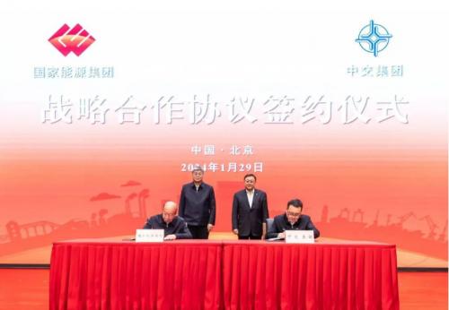 國(guó)家能源集團(tuán)黨組書(shū)記、董事長(zhǎng)劉國(guó)躍與中交集團(tuán)黨委書(shū)記、董事長(zhǎng)王彤宙會(huì)談并見(jiàn)證簽約,集團(tuán)黨組成員、副總經(jīng)理?xiàng)铢i,中交集團(tuán)副總裁楊志超代表雙方簽約。