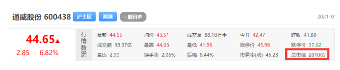 2021年1月22日,通威股份市值突破2000億元,成為隆基股份之后又一家市值破2000億的光伏企業(yè)!