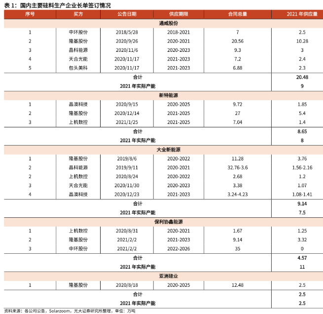 在經(jīng)歷了19年的硅料產(chǎn)能釋放周期后,2020年我國硅料產(chǎn)能增量有限,且海外OCI先后關(guān)停韓國兩家多晶硅工廠(總產(chǎn)能從7.9萬噸滑落至3.2萬噸),2020年國內(nèi)硅料在產(chǎn)產(chǎn)能從2019年的45.6萬噸小幅提升至48.4萬噸,全球硅料在產(chǎn)產(chǎn)能則從2019年底的62.2萬噸減少1.9萬噸至60.3萬噸。2021年,國內(nèi)的新產(chǎn)能投放大多集中在Q4,因此對全年的實際產(chǎn)能貢獻有限,預計2021年全球的硅料供應量約為55萬噸,可滿足約170GW的硅片生產(chǎn)需求。與此同時,下游的硅片廠商則在高利潤留存的背景下在2019年開啟了大規(guī)模擴產(chǎn)浪潮。2019年在上游環(huán)節(jié)價格下跌的情況下硅片價格依然堅挺,單晶硅片環(huán)節(jié)相較其他供應鏈環(huán)節(jié)仍存在較高的利潤空間,因此各硅片企業(yè)均開啟了較為激進的擴張計劃,全國單晶硅片總名義產(chǎn)能從2019年的120GW擴張至2020年的217GW。展望2021年,各大硅片龍頭及二、三線硅片企業(yè)仍維持了較大規(guī)模的產(chǎn)能擴張節(jié)奏,2021年底的單晶硅片名義產(chǎn)能有望再創(chuàng)新高突破300GW。在2021年硅料實際貢獻有限、而硅片產(chǎn)能大幅擴張的背景下,硅片廠商于2020Q3開始密集通過和上游硅料企業(yè)簽訂鎖量不鎖價的硅料供貨長協(xié)鎖定硅料供應,從而滿足自身的生產(chǎn)需求。根據(jù)我們的統(tǒng)計,2021年已有超過80%的硅料產(chǎn)能被長協(xié)合同鎖定,主流硅料生產(chǎn)廠商中僅有保利協(xié)鑫的部分硅料產(chǎn)能尚未簽訂長協(xié)合同。