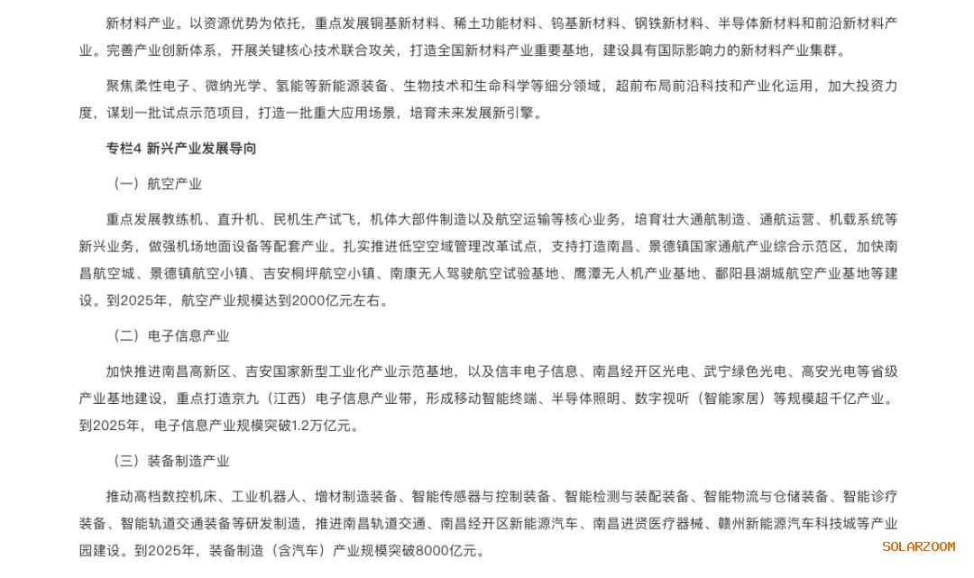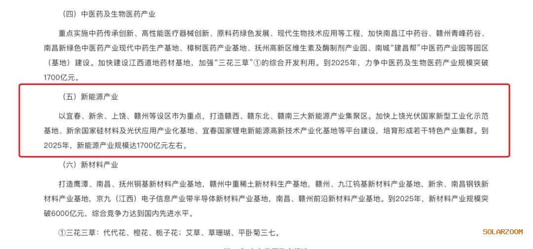 以宜春、新余、上饒、贛州等設(shè)區(qū)市為重點,打造贛西、贛東北、贛南三大新能源產(chǎn)業(yè)集聚區(qū)。加快上饒光伏國家新型工業(yè)化示范基地、新余國家硅材料及光伏應(yīng)用產(chǎn)業(yè)化基地、宜春國家鋰電新能源高新技術(shù)產(chǎn)業(yè)化基地等平臺建設(shè),培育形成若干特色產(chǎn)業(yè)集群。到2025年,新能源產(chǎn)業(yè)規(guī)模達1700億元左右。