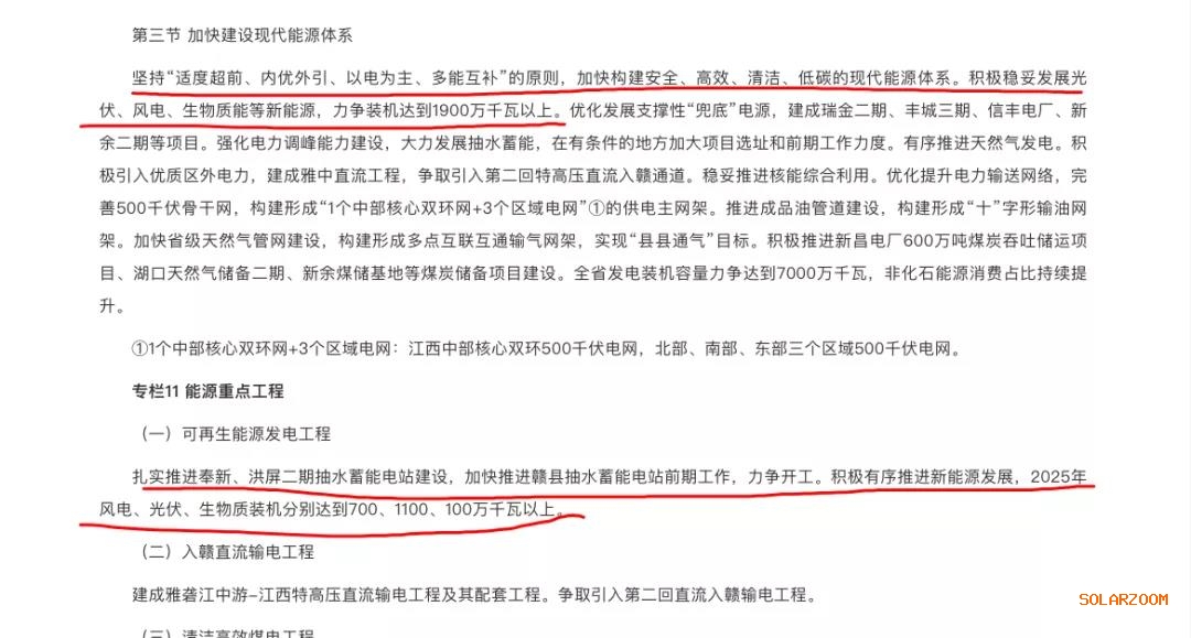 文件顯示,江西省將在“十四五”期間堅持“適度超前、內(nèi)優(yōu)外引、以電為主、多能互補”的原則,加快構(gòu)建安全、高效、清潔、低碳的現(xiàn)代能源體系。積極穩(wěn)妥發(fā)展光伏、風電、生物質(zhì)能等新能源,到2025年力爭裝機達到1900萬千瓦以上。其中,風電、光伏、生物質(zhì)裝機分別達到700、1100、100萬千瓦以上。