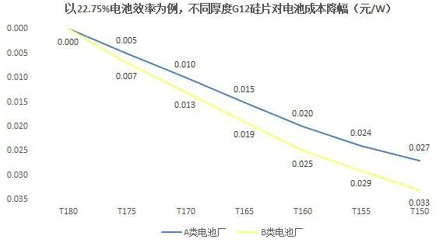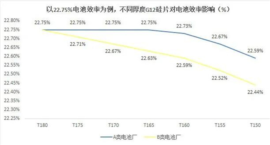 硅片減薄對(duì)效率有一定的影響,對(duì)此,中環(huán)股份提出測(cè)算。以22.75%電池效率為例,不同厚度G12硅片對(duì)電池效率影響是,A類(lèi)電池廠商的生產(chǎn)條件下,應(yīng)用160μm硅片的電池的效率,比175μm的低0.02%。