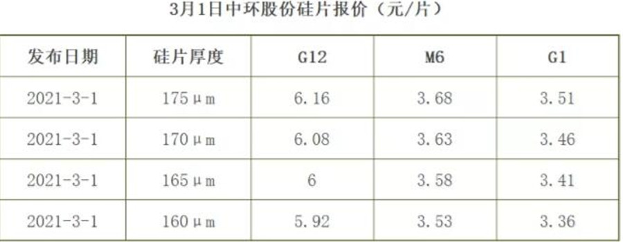 參考中環(huán)股份2月份報(bào)價(jià),M6(175μm)售價(jià)為3.35元/片,那么3月份M6(160μm)報(bào)價(jià)漲價(jià)0.18元/片,漲幅為5.3%。