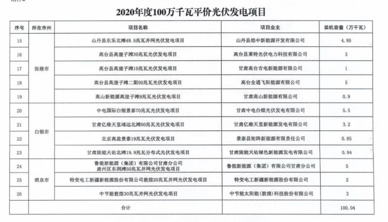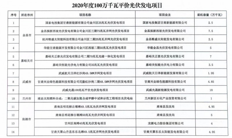 3月25日,甘肅省發(fā)改委發(fā)布《關(guān)于加快推進(jìn)全省新能源存量項(xiàng)目建設(shè)工作》的通知。文件明確,甘肅省目前新能源存量項(xiàng)目約600萬千瓦。其中,光伏發(fā)電項(xiàng)目1.23GW包括:酒湖直流工程配套23.5萬千瓦光伏發(fā)電項(xiàng)目以及《國家發(fā)展改革委辦公廳國家能源局綜合司關(guān)于公布2020年風(fēng)電、光伏發(fā)電平價上網(wǎng)項(xiàng)目的通知》(發(fā)改辦能源〔2020〕588號)中尚未并網(wǎng)100萬千瓦光伏發(fā)電項(xiàng)目。