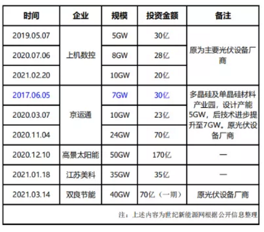 京運(yùn)通創(chuàng)立之初,業(yè)務(wù)并未涉及單晶硅業(yè)務(wù),光伏設(shè)備為其主要支撐,與賽維LDK的“糾葛”在業(yè)內(nèi)較為知名。2017年6月5日,京運(yùn)通發(fā)布公告稱(chēng),與內(nèi)蒙古烏海市政府簽署了《烏海京運(yùn)通新材料產(chǎn)業(yè)園項(xiàng)目投資協(xié)議》,就建設(shè)設(shè)計(jì)5GW多晶硅及單晶硅材料為主的產(chǎn)業(yè)園區(qū)達(dá)成合作意向,總投資約為30億元。后由于技術(shù)進(jìn)步,該項(xiàng)目產(chǎn)能提升至7GW。2020年3月、2020年11月,京運(yùn)通邁出了擴(kuò)產(chǎn)的步伐。從2020年年末至2021年1月,短短20天時(shí)間,京運(yùn)通與晶澳、江蘇新潮、通威、江蘇潤(rùn)陽(yáng)悅達(dá)簽署高達(dá)168億單晶硅長(zhǎng)單。