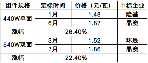 在價(jià)格方面,2021年上半年隨著組價(jià)集采的推進(jìn),組件價(jià)格受硅料上漲影響,其報(bào)價(jià)也呈現(xiàn)快速上漲的趨勢(shì)。從年初中核集團(tuán)第一批1.3GW組件集采,隆基單面450組件報(bào)出1.48/瓦元的中標(biāo)價(jià)格,到今年6月蒙能包頭50MW技術(shù)領(lǐng)跑項(xiàng)目中晶澳以450單面1.87元/瓦的中標(biāo)價(jià)格拿下上半年“標(biāo)王”,組件漲幅約26%左右。相較于去年1.55元/瓦的定標(biāo)均價(jià)而言,今年440+組件已經(jīng)來(lái)到1.7元/瓦上下;540雙面則由3月廣東電力第一批組件集采的1.52元/瓦的中標(biāo)價(jià)上漲至7月廣東電力第三批組件集采的1.86元/瓦中標(biāo)價(jià)格,漲幅約22.37%。