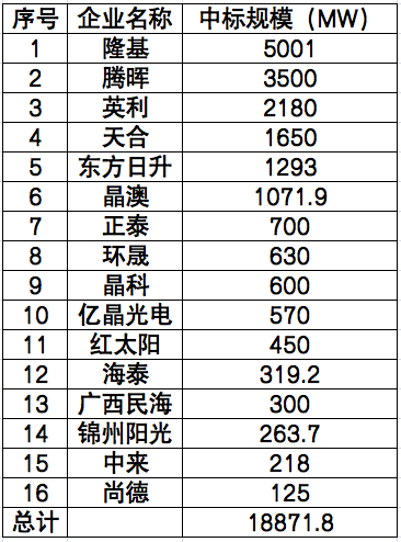 從定標(biāo)情況來(lái)看,由于部分央企采取的是框架招標(biāo),實(shí)際中標(biāo)人并未明確,在剔除此類招標(biāo)逾10GW后,明確中標(biāo)人的定標(biāo)規(guī)模約為19GW。其中,中標(biāo)規(guī)模TOP5依次為隆基、騰暉、英利、天合、東方日升;在一二線組件企業(yè)占比中,TOP6組件企業(yè)中標(biāo)規(guī)??傆?jì)為9.616GW,占明確中標(biāo)人總規(guī)模比重為51%。