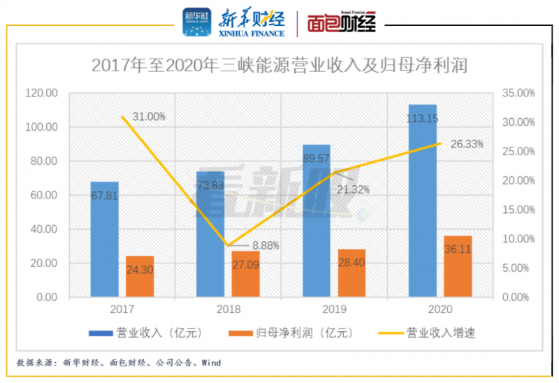 三峽能源主營(yíng)業(yè)務(wù)為風(fēng)能、太陽能的開發(fā)、投資和運(yùn)營(yíng)。2018年至2020年,公司實(shí)現(xiàn)營(yíng)業(yè)收入分別為73.83億元、89.57億元、113.15億元,同比分別增加8.88%、21.32%、26.33%;實(shí)現(xiàn)歸母凈利潤(rùn)分別為27.09億元、28.40億元、36.11億元,同比分別增加11.48%、4.84%、27.16%。