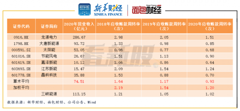應(yīng)收賬款規(guī)模較大的現(xiàn)象,在風(fēng)電、光電行業(yè)較為普遍。根據(jù)三峽能源招股書中提到的龍?jiān)措娏Φ?家上市公司列為可比公司(華能新能源已退市,不列入可比范圍),對(duì)其應(yīng)收賬款周轉(zhuǎn)率進(jìn)行統(tǒng)計(jì)如圖: