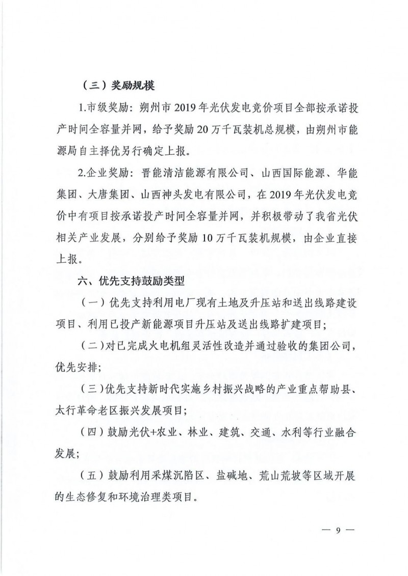 值得注意的是,為了鼓勵光伏建設(shè),山西省進行了市級獎勵和企業(yè)獎勵。其中,朔州市2019年光伏發(fā)電競價項目全部按承諾投產(chǎn)時間全容量并網(wǎng),給予獎勵20萬千瓦裝機總規(guī)模,由朔州市能源局自主擇優(yōu)另行確定上報。