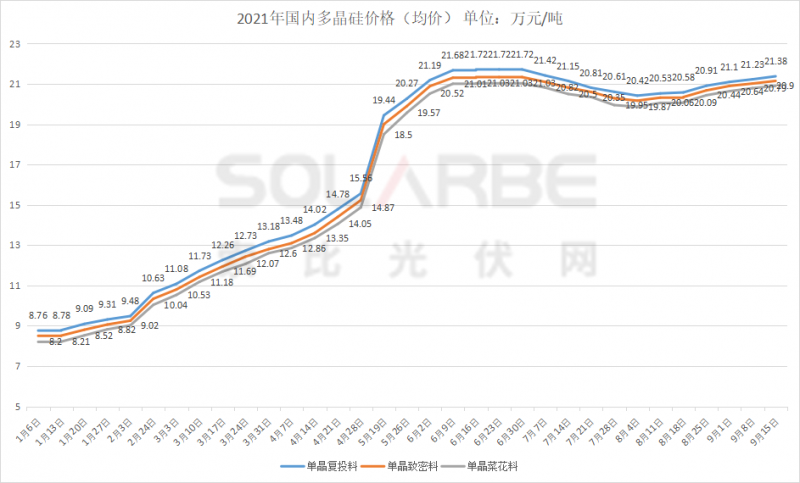 9月15日,硅業(yè)分會(huì)發(fā)布了本周國內(nèi)多晶硅成交價(jià)。其中單晶復(fù)投料價(jià)格區(qū)間在20.6-21.9萬元/噸,成交均價(jià)小幅上漲至21.38萬元/噸,周環(huán)比漲幅為0.71%;單晶致密料價(jià)格區(qū)間在20.4-21.7萬元/噸,成交均價(jià)上漲至21.15萬元/噸,周環(huán)比漲幅為0.62%。