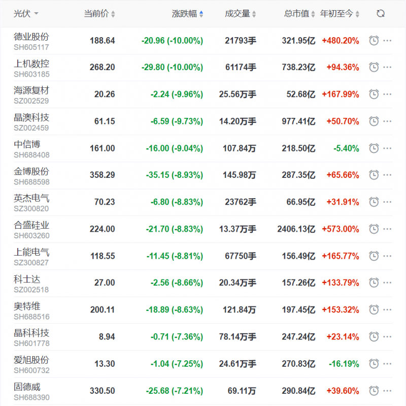 而近期掀起的又一波漲價(jià)潮,也最終反應(yīng)在資本市場(chǎng)。截止中午休盤時(shí)間,德業(yè)股份、上機(jī)數(shù)控主板跌停下跌10%、海源復(fù)材下跌9.96%、晶澳科技下跌9.73%、中信博下跌9.04%。