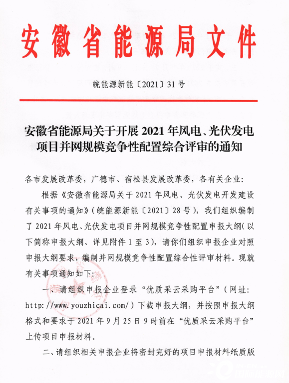 9月25日,安徽省招標(biāo)集團(tuán)將組織開展安徽省2021年風(fēng)電、光伏發(fā)電項目并網(wǎng)規(guī)模競爭性配置綜合性評審。評審工作全程采用電子化方式進(jìn)行,申報人員無需現(xiàn)場參與。
