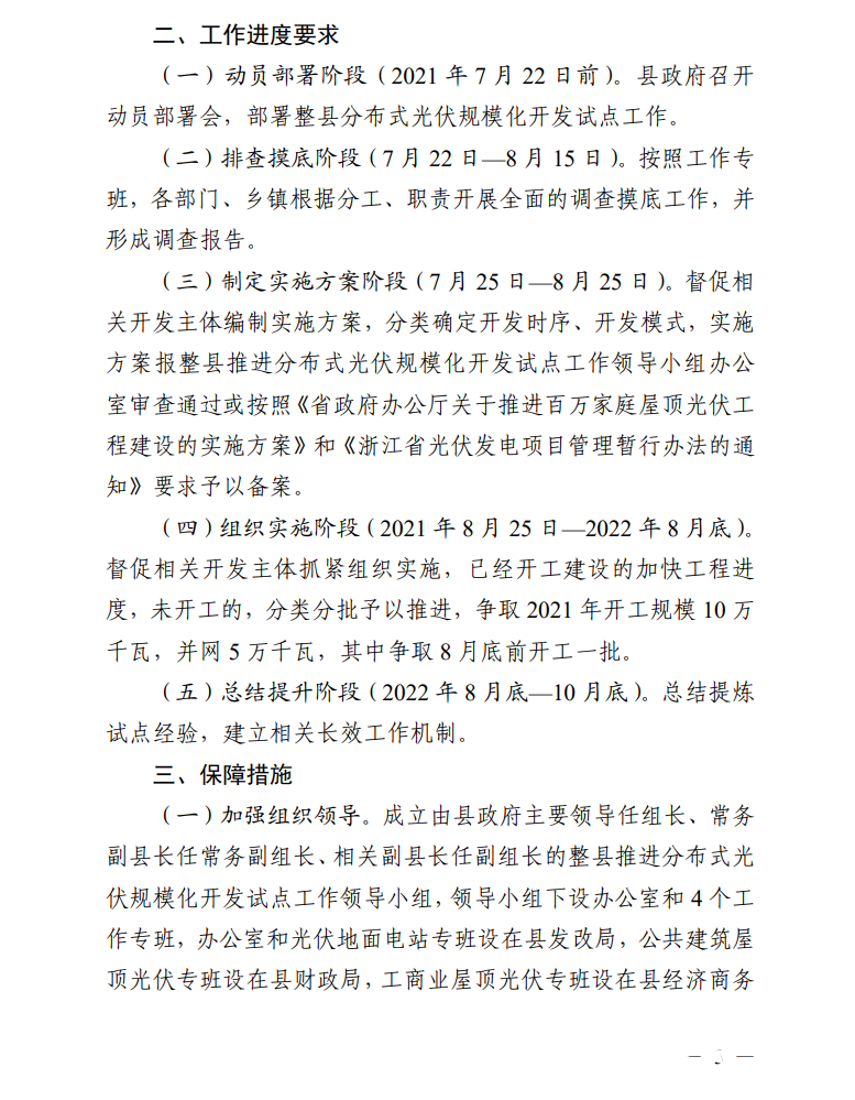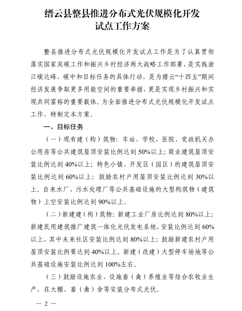 日前,縉云縣人民政府辦公室發(fā)布關(guān)于印發(fā)《縉云縣整縣推進(jìn)分布式光伏規(guī)?;_發(fā)試點(diǎn)工作方案》《縉云縣分布式光伏資源調(diào)查摸底工作方案》的通知。通知明確,縉云縣整縣推進(jìn)分布式光伏規(guī)?;_發(fā)試點(diǎn)工作目標(biāo)任務(wù)為: