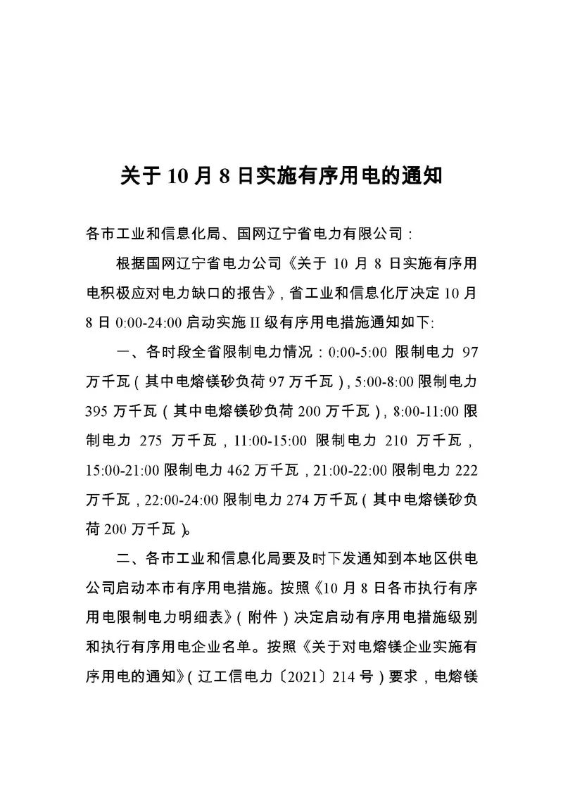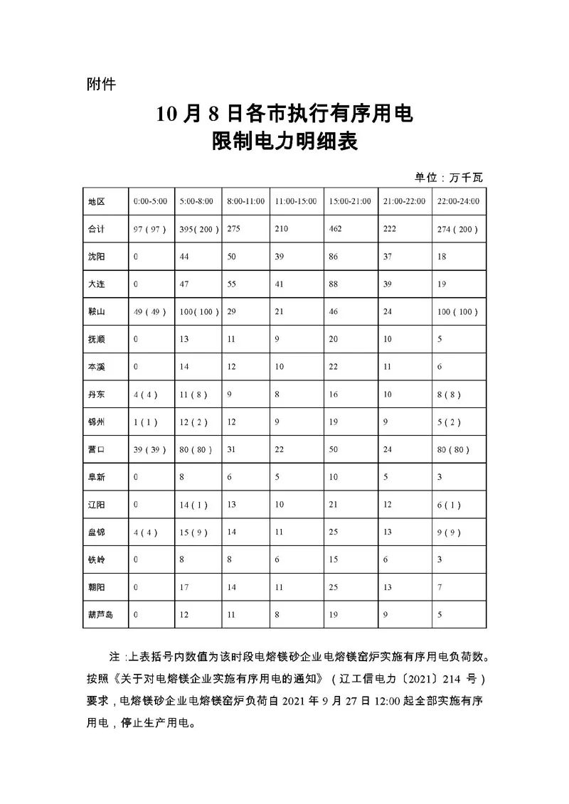 根據(jù)電力供需平衡預(yù)測,10月8日遼寧省最大電力缺口為462萬千瓦,依據(jù)國家發(fā)改委《有序用電管理辦法》,為嚴重缺電II級橙色預(yù)警。決定10月8日0:00-5:00限制電力97萬千瓦,5:00-8:00限制電力395萬千瓦,8:00-11:00限制電力275萬千瓦,11:00-15:00限制電力210萬千瓦,15:00-21:00限制電力462萬千瓦,21:00-22:00限制電力222萬千瓦,22:00-24:00限制電力274萬千瓦。
