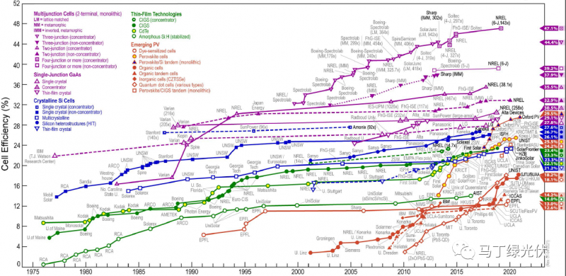 由鈣鈦礦電池和晶體硅組成的疊層電池理論轉換率極限可達43%。