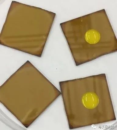 目前來看,鈣鈦礦材料對水汽或高溫較為敏感。直接暴露的高濕環(huán)境下,形成的鈣鈦礦結構將會快速失效,變?yōu)榉氢}鈦礦結構,同時特有的棕褐色也會發(fā)生變化(如下圖,水滴滴在鈣鈦礦材料表面時,顏色發(fā)生了明顯的變化。所以,材料穩(wěn)定性與封裝的研究至關重要。在2021年初,杭州纖納重磅宣布了全球首個通過了基于IEC61215標準的加嚴穩(wěn)定性證書,邁出了鈣鈦礦組件商業(yè)化堅實的一步。