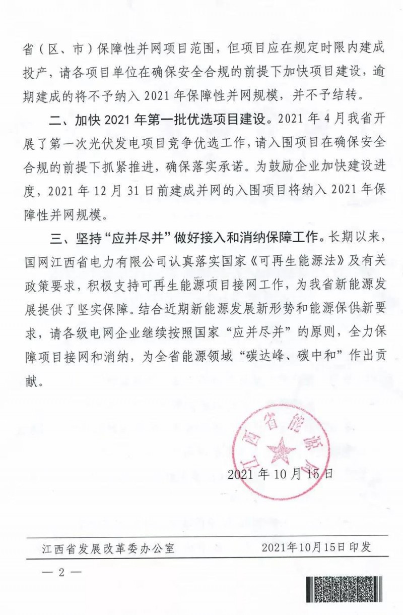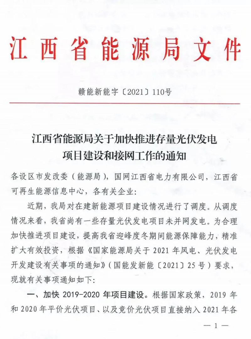 江西省能源局日前印發(fā)《關于加快推進存量光伏發(fā)電項目建設和接網工作的通知》明確提出,堅持“應并盡并”做好接入和消納保障工作,加快2019-2020年項目建設,加快2021年第一批優(yōu)選項目建設。