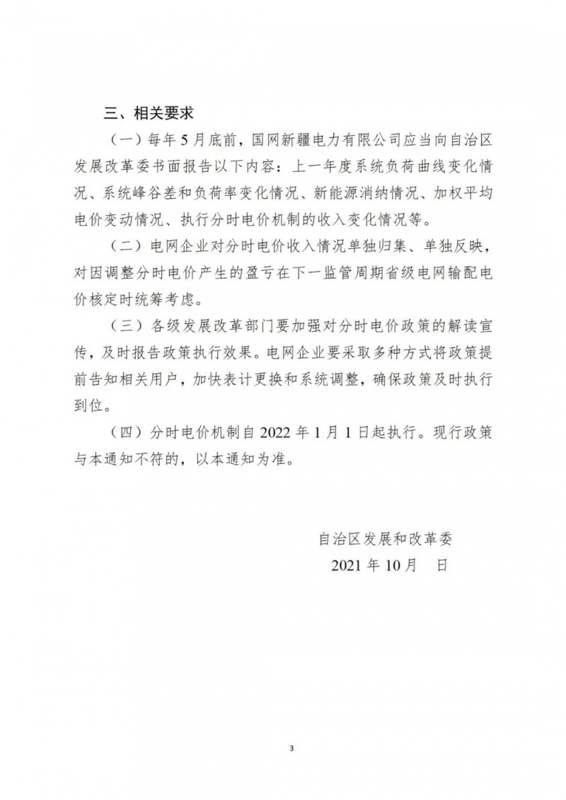 10月15日,新疆發(fā)改委公布了關(guān)于公開征求《關(guān)于完善我區(qū)分時(shí)電價(jià)機(jī)制有關(guān)事項(xiàng)的通知》意見的公告。為適應(yīng)自治區(qū)電力系統(tǒng)峰谷特性變化、電力市場(chǎng)加快建設(shè)和新能源快速發(fā)展的新形勢(shì)新要求,新疆發(fā)改委起草了《關(guān)于完善我區(qū)分時(shí)電價(jià)機(jī)制有關(guān)事項(xiàng)的通知(征求意見稿)》。此次征求意見建議的時(shí)間為即日起的7個(gè)工作日內(nèi)。