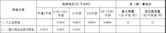 注:1. 表中電價(jià)含增值稅、線損及交叉補(bǔ)貼、區(qū)域電網(wǎng)容量電價(jià),不含政府性基金及附加。2. 一般工商業(yè)及其他、大工業(yè)用電的輸配電價(jià)水平執(zhí)行上表,并按規(guī)定標(biāo)準(zhǔn)另行征收政府性基金及附加,基金及附加標(biāo)準(zhǔn)(分/每千瓦時(shí)):國(guó)家重大水利建設(shè)基金0.403875分、大中型水庫(kù)移民扶持基金0.62分、可再生能源附加1.9分。