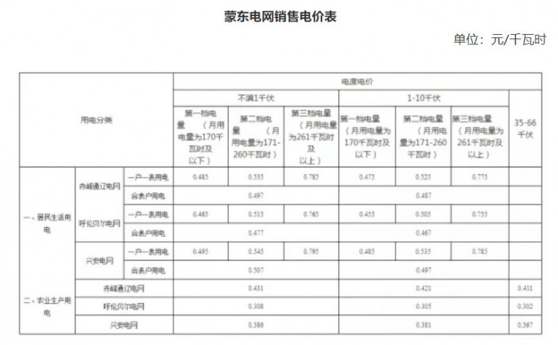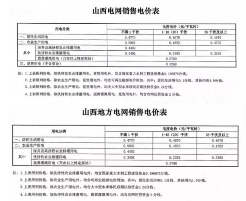 注:1.上表所列價(jià)格,均含國(guó)家重大水利工程建設(shè)基金0.1125分錢。2.上表所列價(jià)格,除農(nóng)業(yè)生產(chǎn)用電外,均含大中型水庫(kù)移民后期扶持資金0.23分錢、可再生能源電價(jià)附加0.1分錢。3.對(duì)城鄉(xiāng)“低保戶”和農(nóng)村牧區(qū)“五保戶”家庭每戶每月設(shè)置15度免費(fèi)用電基數(shù),分別按照表中居民生活用電第一檔電量電價(jià)標(biāo)準(zhǔn)收取及返還。4.對(duì)執(zhí)行居民生活用電、農(nóng)業(yè)生產(chǎn)用電的電壓等級(jí)在35-110千伏及以上的用戶,按表中1-10千伏所對(duì)應(yīng)的電度電價(jià)標(biāo)準(zhǔn)執(zhí)行。