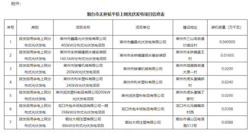 附件:煙臺市無補(bǔ)貼平價(jià)上網(wǎng)光伏發(fā)電項(xiàng)目信息表