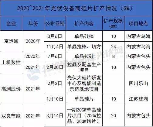 而2021年截至目前,隆基暫未公開硅片相關(guān)擴(kuò)產(chǎn)計劃,2020年其在云南新擴(kuò)70GW單晶產(chǎn)能。